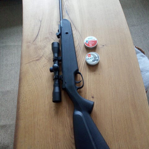 Ett luftgevär 4,5 mm med sikte och ammunition.