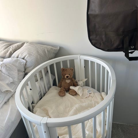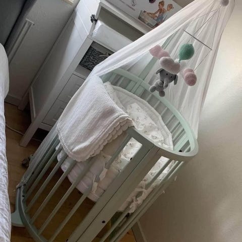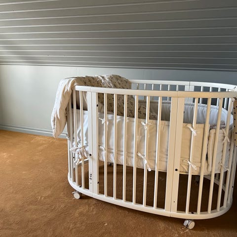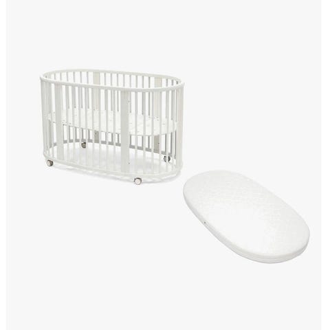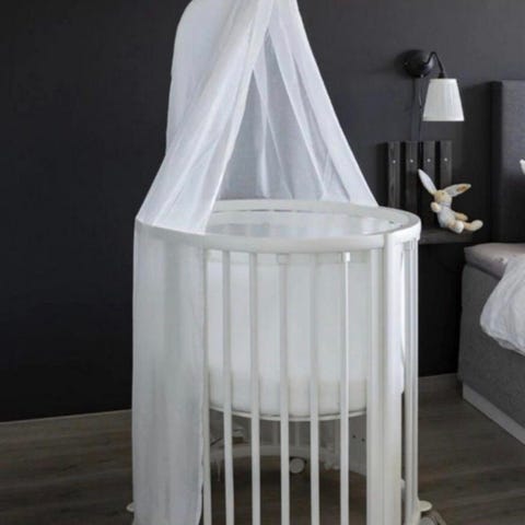 Stokke spjälsäng i vit trä med oval form och hjul för enkel förflyttning. Passar för barn och erbjuder en säker och bekväm sovplats. Måtten är cirka 141 cm i längd, 84 cm i bredd och 74 cm i höjd. Sida som inte syns på bilden fins fortfarande