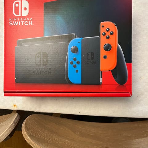 Nintendo Switch Spelkonsol med Joy-Con i blå och röd färg. Inkluderar konsol, Joy-Con-kontroller, dockningsstation, strömadapter, HDMI-kabel, handkontroll, förvaringsväska med Zelda motiv samt spelet Mario Kart 8 Deluxe. Lämplig för spel på TV eller som bärbar enhet. Tillverkad 2023.