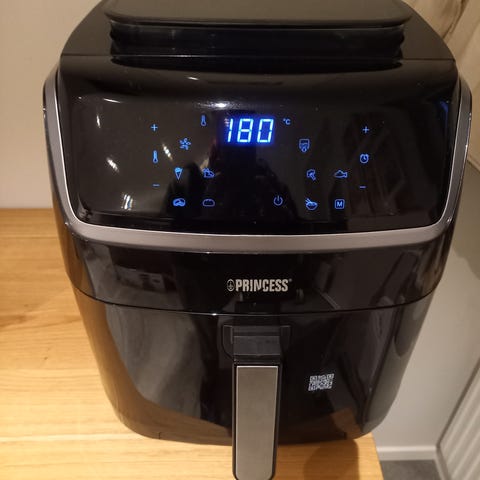 Airfryer i svart färg med digital kontrollpanel och handtag. Passar för tillagning av olika maträtter med varmluftsteknik. Endast använd 2ggr, hämtas vid Odenplan!