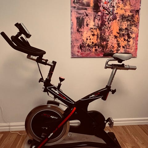 Abilica spinningcykel (motionscykel) i vit färg, mycket gott skick (använd få gånger). Utrustad med justerbar sadel och styre för anpassad passform. Stabil konstruktion och cykeln har ett 22 kg svänghjul som ger stabil och jämn träning. Passar för inomhusträning och konditionsövningar. Kompatibel med SPD.