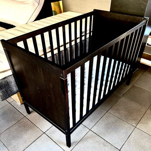 Spjälsäng med en oanvänd madrass och två uppsättningar med sängkläder samt täcke.