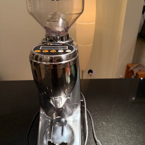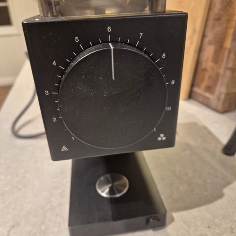 Ascaso kaffekvarn i svart färg. Kaffekvarnen har en genomskinlig behållare för kaffebönor och en justerbar malningsinställning. Enheten är avsedd för hemmabruk och har en kompakt design.