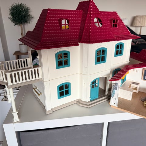 Schleich lekset bestående av ett hus och ett stall med röd takfärg och turkosa dörrar. Setet inkluderar flera djurfigurer, människor, möbler såsom bord och stolar, samt olika tillbehör som parasoll, stege och redskap.