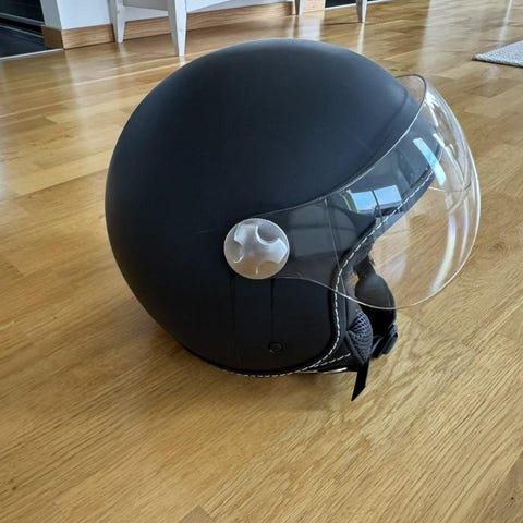 Hjälm med integrerat visir i svart färg. Hjälmen har ventilationsöppningar och justerbart hakband för bättre passform. Visiret är genomskinligt och täcker ansiktet för skydd. Innersidan är vadderad för komfort.