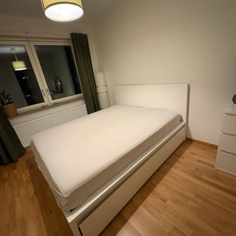 Ikea malm sängstomme för 160 madrass. Ingår 4 sänglådor. Finns ej i sortiment längre i denna storlek och färg (ekfaner) med lådor.