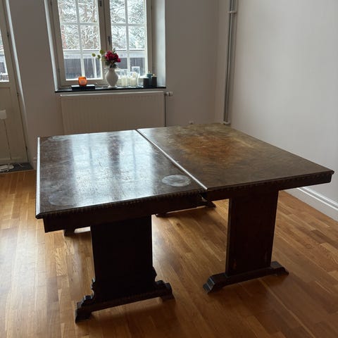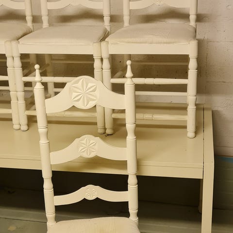 Bra och stabilt bord. Kökstolar ok skick. Blir som nytt med färg. Finns fläckar och avskav