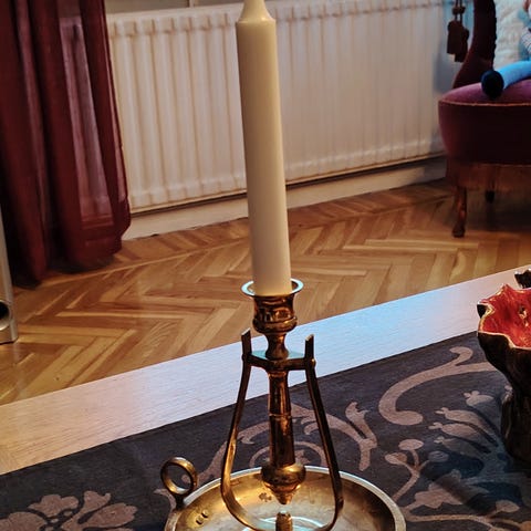 Ljusstake i smidesjärn med dekorativ design. Passar för placering på golv eller bord. Färgen är svart och materialet är metall.