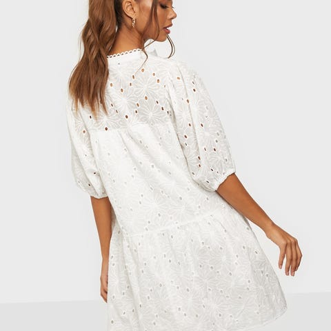 Beige skjorta med långa ärmar, krage och knäppning framtill. Skjortan har två bröstfickor med lock och knappar. Den har en avslappnad passform och kan bäras både öppen och stängd. Skjortan kan även knytas i midjan med ett medföljande band.