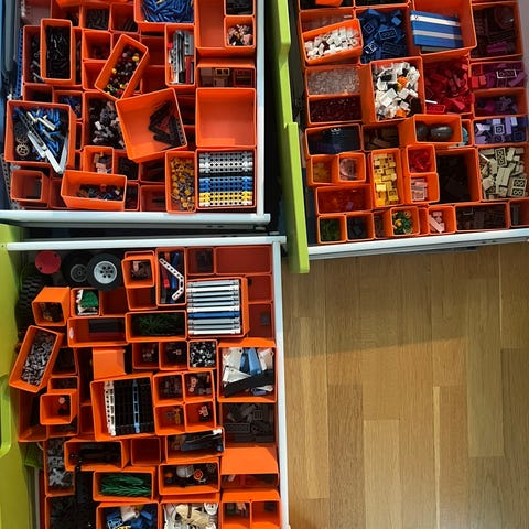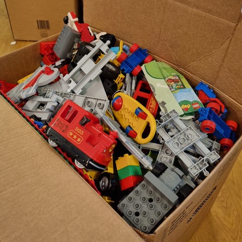 Tre förvaringslådor 50x25x15 fulla med blandat Duplo bl.a. en tågbana. En byggplatta ingår också. Lådorna ingår.