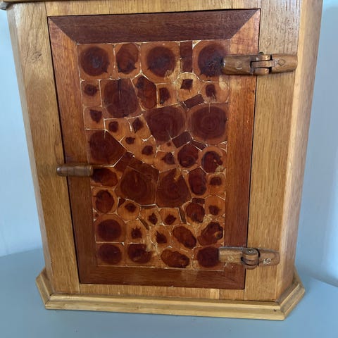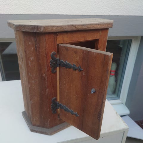 Antikt träskåp med snidade dörrar som visar detaljerade motiv. Skåpet har två dörrar och flera hyllplan inuti för förvaring. Tillverkat i trä med en mörk finish. Passar för användning som förvaringsmöbel i hemmet.