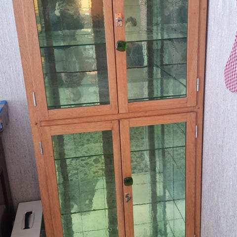 2 st hembyggda vitrinskåp för vägg. Luckorna är gamla stugfönster. Säljes endast tillsammans. Bredd 45cm resp 58,5. Kontant eller Swish vid avhämtning.