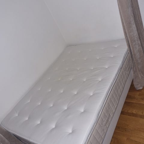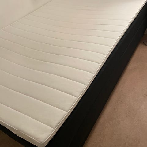 Kontinentalsäng 140x200 cm. 1 vändbar resårmadrass med pocketfjädrar 250/m², vadderad med polyeterskum. Madrassen är indelad i 7 komfortzoner, som ger ett unikt, ergonomiskt korrekt stöd. 1 bäddmadrass, 4 cm tjock med polyeterskumkärna. Tvättbart stretchöverdrag med tjock quiltning. Nederst 1 ram. Inkl. ben. Exkl. sänggavel. Nytt överdrag till bottenramen i mörkgrå tyg från IKEA.