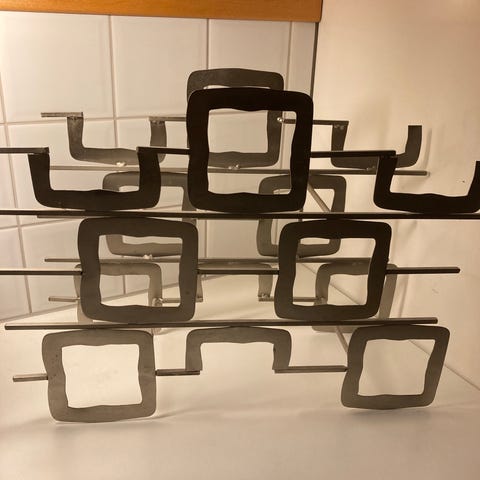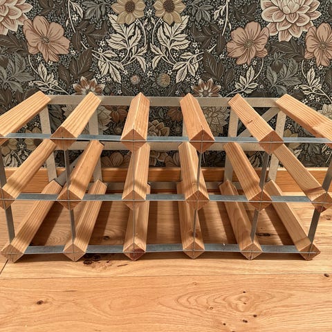Vinställ som håller 6 vinflaskor. Gjord av trä, sparsamt använt. Passar att ha i bokhyllan, etc.