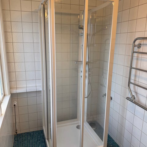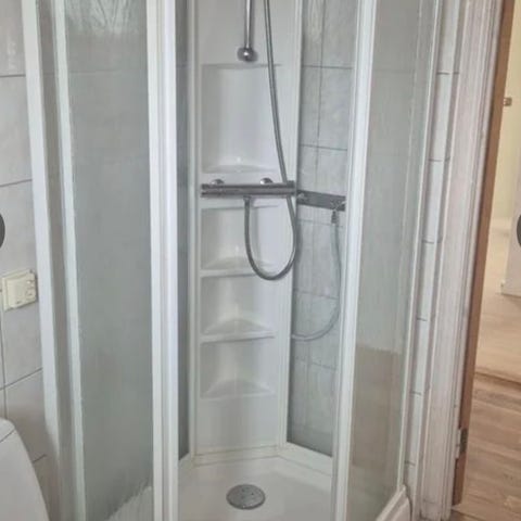 Skyddplast sitter kvar på bottendelen och inga hål har gjorts för duschväggarna.