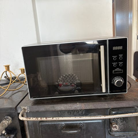Logik mikrovågsugn i vit färg. Utrustad med manuell kontrollpanel med vred för inställning av tid och effekt. Passar för uppvärmning och tillagning av mat. Tidigare använd i garage, fin på utsidan, litet märke innanför dörr vilket syns på bild.