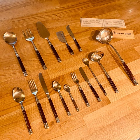 Salladsbestick inköpta i Assisi i Italien. Besticken är tillverkade i trä med handmålade dekorativa keramik handtag i olika färger och mönster. Passar för servering som salladsbestick. Inköpta i den keramikverkstad där handtagen är tillverkade.