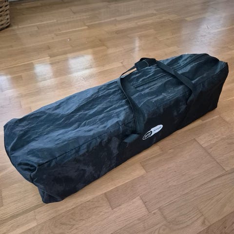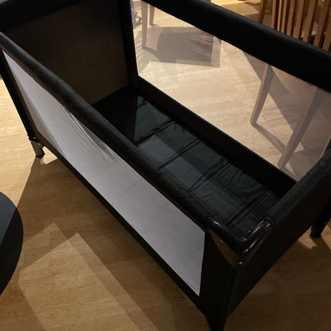 Resesäng avsedd för barn. Sängen är svart och tillverkad för att vara portabel och lätt att resa med.