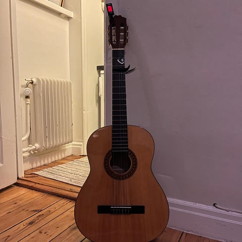 Akustisk gitarr av klassisk typ med träfärgad kropp och sex strängar. Gitarren har en traditionell design med en rund ljudhål och en mörkare träfärgad hals och greppbräda. Passar för akustisk musik och nybörjare.