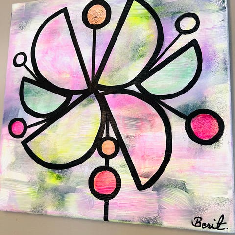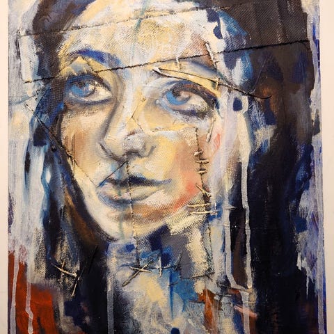 Konstverk föreställande ett abstrakt ansikte med geometriska former i färger som blått, rött och lila.
