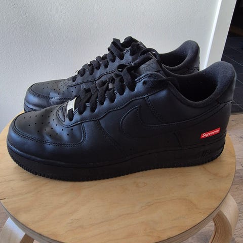 Nike sneakers i storlek 41, svart färg. Skorna är tillverkade i lädermaterial och har detaljer i svart med en röd Supreme-logotyp på sidan. Produkten levereras med originalkartong och extra skosnören.