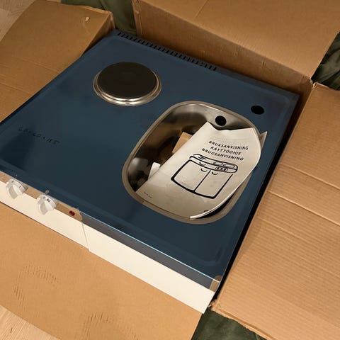 Minikök med kyl och köldfack , disko , diskbänksblandare , spishäll . 100x60 cm