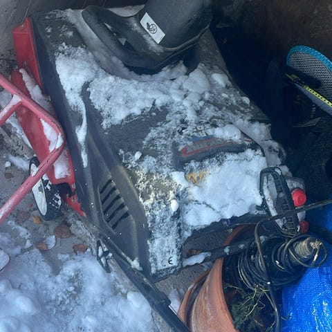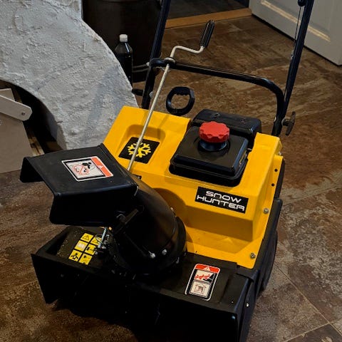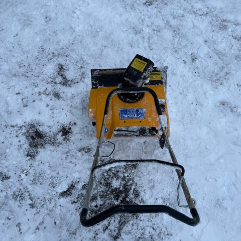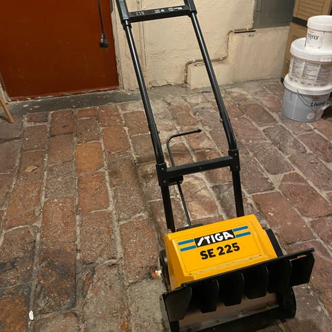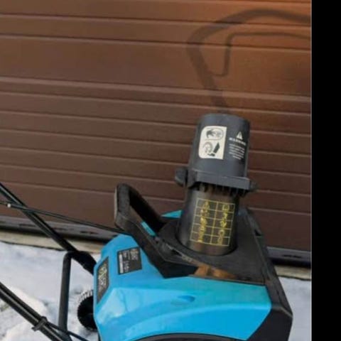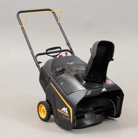 Gilson ST320 snöslunga med röd färg och handtag i metall. Utrustad med reglage och spakar för styrning och funktion. Maskinen är avsedd för att röja snö och har hjul för enkel manövrering.