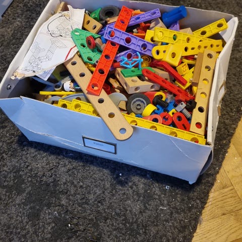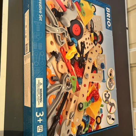 BRIO byggsats barnleksak med olika trädelar, hjul, skruvar och verktyg i flera färger. Innehåller flera olika byggsatspaket