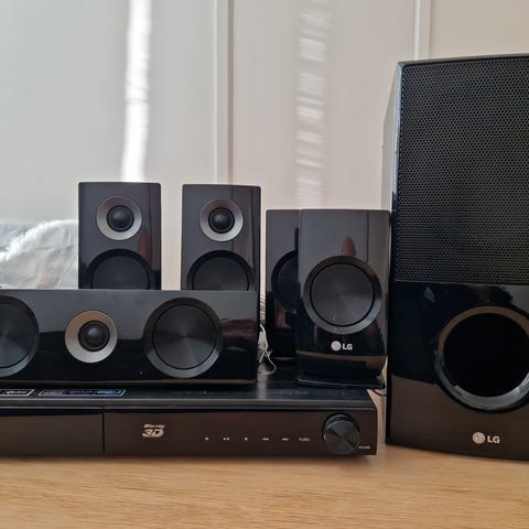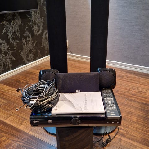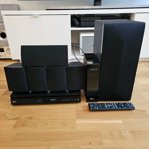 LG hemmabiosystem med subwoofer och flera högtalare. Systemet inkluderar en huvudspelare med anslutningar för optisk, trådlös och FM-antenn. Enheten är märkt med modellinformation och CE-märkning. Komplett med fjärrkontroll och kablar för anslutning.
