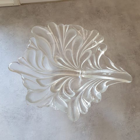 Set med flera skålar i glas formade som blad. Skålarna är genomskinliga och har detaljerade bladstrukturer. Passar för servering eller dekoration