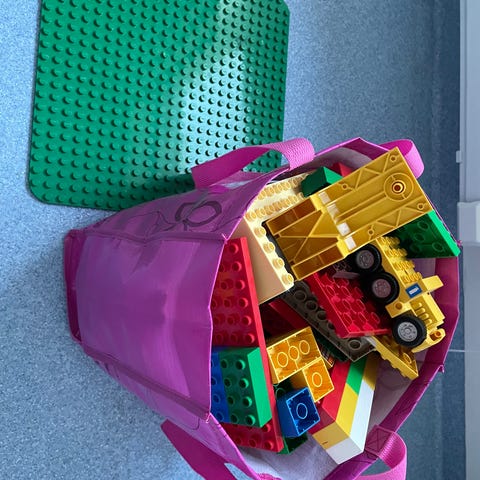En papperskasse med blandade duplo klossar, två stora byggplattor, gubbar och djur. Man kan bygga hus, träd och palmer, glassar och allt möjligt.
