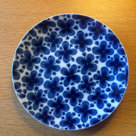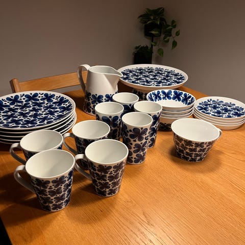 Rörstrand servisdel med blå blomdekor på vit bakgrund. Tallriken har en rund form och är tillverkad av porslin. Passar för servering av mat.