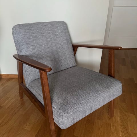 Säljer en stilren och bekväm IKEA-fåtölj i klassisk retrodesign. Köpt 2014 och har varit sparsamt använd i rök- och djurfritt hem.