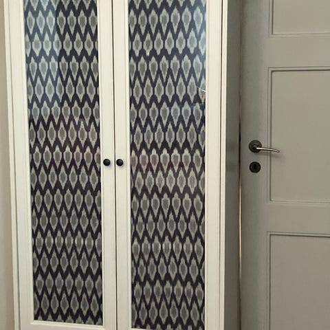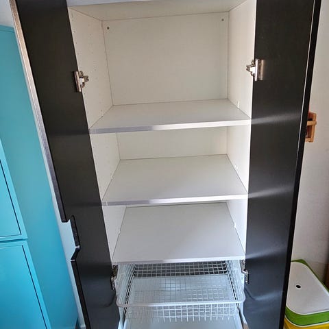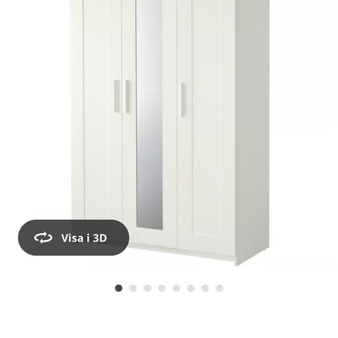 IKEA garderobskåp i vitt med två dörrar och orangea handtag. Skåpet är avsett för förvaring av kläder och har två klädstänger inuti. Extra hylla i botten.