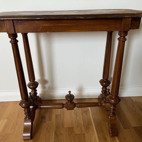 Sidobord i trä med rektangulär bordsskiva och en utdragbar låda framtill. Bordet har en dekorativ lyrformad mittdel med svarvade detaljer och strängliknande mässing stänger. Underredet avslutas med profilerad fot med tassformade ben. Passar som sybord avlastningsbord eller litet lampbord i vardagsrum, hall eller sovrum.
