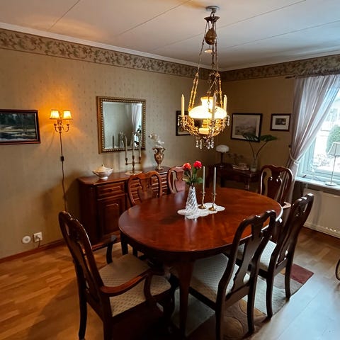 Matgrupp: bord, stolar och hörnskåp