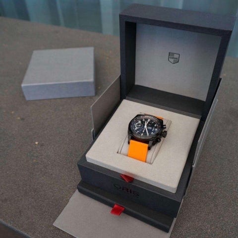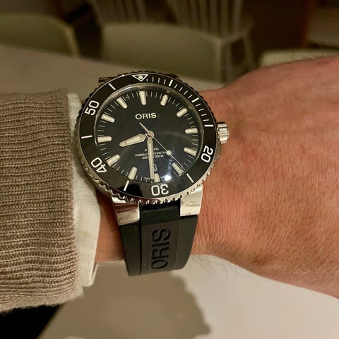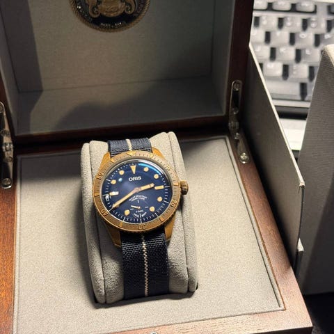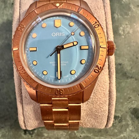 Oris Big Crown (38 mm). Grön urtavla och automatiskt urverk. Levereras med originalarmband och ytterligare tre armband från Watchgecko, två i läder och ett i segelduk, samt förvaringsfodral i läder, originallåda och garantibevis.