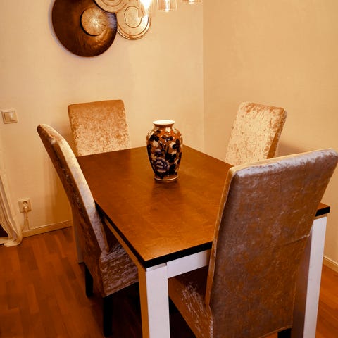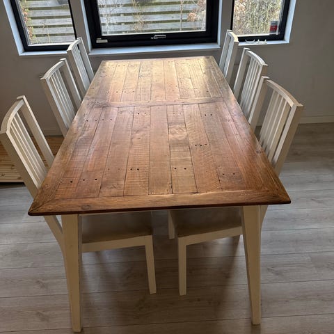IKEA matbord med rund form och fyra matchande trästolar. Bordet är vitt och stolarna i träfärg. Passar för matplats eller kök.
