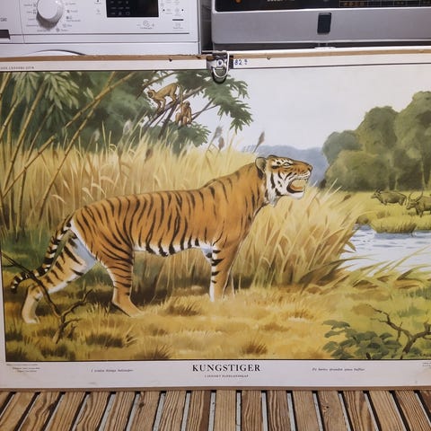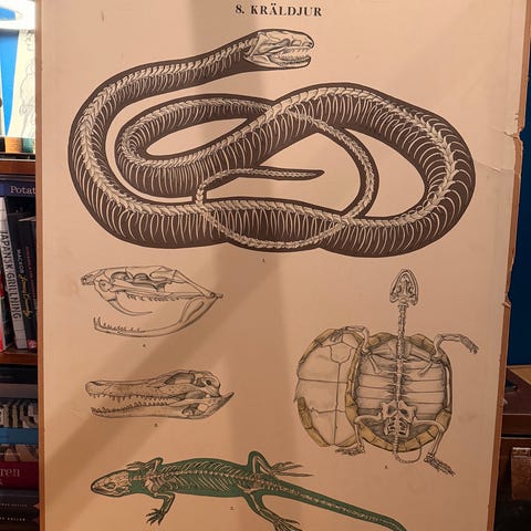 En vintage skolplansch som visar en detaljerad anatomisk illustration av ett djur med fokus på dess inre organ och skelett. Illustrationen inkluderar olika organ och deras placering i kroppen, samt en schematisk bild av djurets skelett. Planchen är avsedd för utbildningsändamål och kan användas som visuellt hjälpmedel vid studier av djuranatomi.
