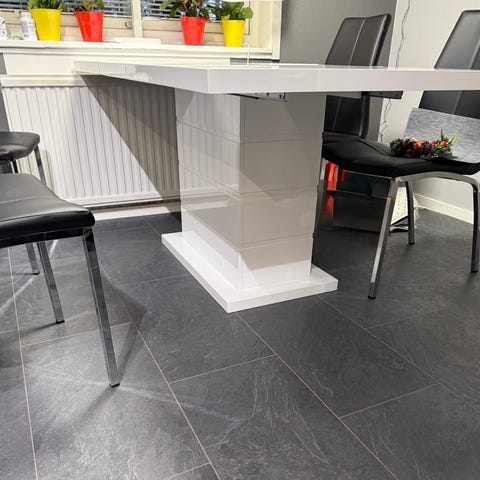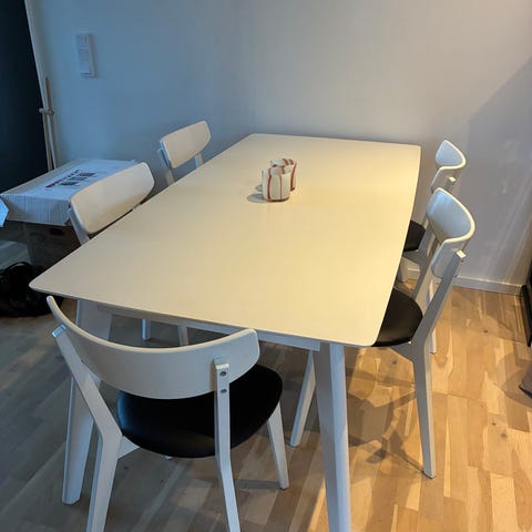Svart matbord med 6 svarta stolar med ljusgrå dyna. Ny klädsel på dynorna. Bordet harxsynlig ådring och kvistar i den svarta färgen. Stolarna har någor enstaka skav, se bild. Fint skick!