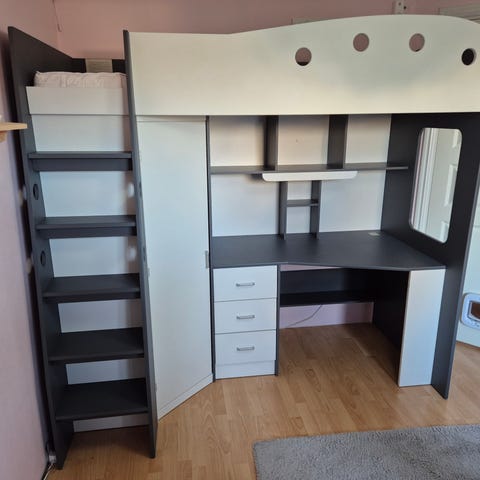 Supersmidig säng som tar lite plats men med mycket förvaring. Lådor, garderob och hyllor. I fint skick. Ingår madrass om man vill ha.