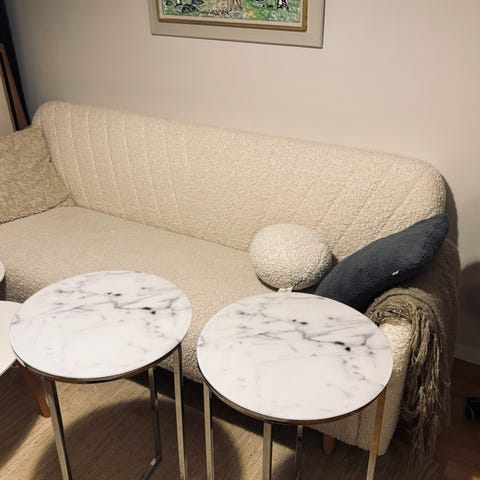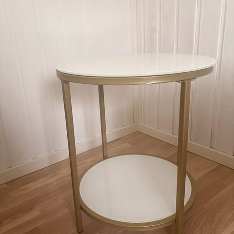 Stilrent och praktiskt sidobord från IKEA med rund vit glasskiva och kromad stomme. Bordet har två hyllplan och står på hjul, vilket gör det lätt att flytta efter behov – perfekt som sidobord i vardagsrum, sovrum eller som extra avlastningsyta. Mycket gott skick, sparsamt använt, inga repor eller skador.