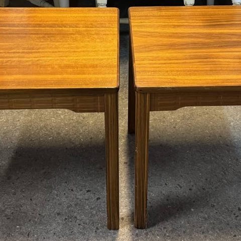 Tre klassiska satsbord/ sidobord från 1950 talet. Design Hans J Wegner och tillverkade i Danmark. Brännmärkning och stämpling undertill ” Design Hans J Wegner, made in Denmark”. Superbra som avställningsyta både till vardag och fest samt smart konstruerade att ta liten plats då man inte vill använda alla 3. Färgförändring på skivan på det största bordet som säkert kan fixas med lite varsam slipning. De andra 2 är utan anmärkning. En fin designmöbler som också är mycket användbar!