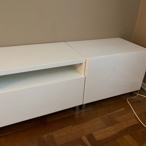 Mycket praktisk tevemöbel med lådor och skåp. Det enda som ser slitet ut är i facken längst ner där det syns att vi dragit lådor ut och in. Syns inte när man har lådor eller korgar på plats.