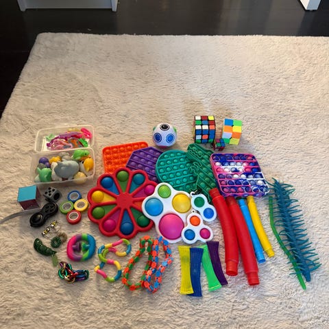 En samling av olika leksaker och stressbollar i varierande färger och material. Innehåller bland annat mjuka och hårda föremål med olika former och texturer, lämpliga för barn eller som stresslindrande hjälpmedel.