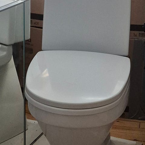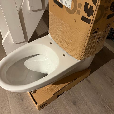 Helt nya vägghängd wc stol från Gustavsberg. Finns två små märken på sidan av skålen(se bild 3)