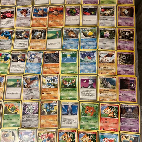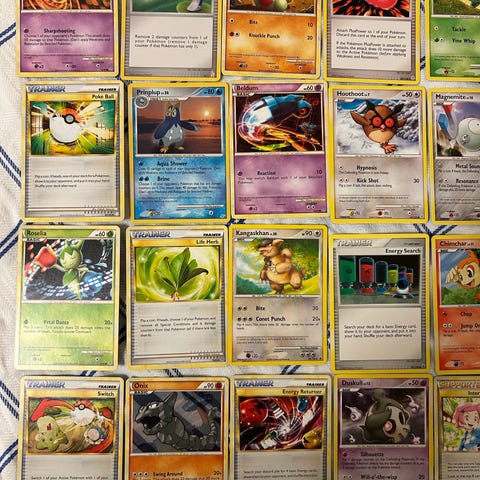 Samling av Pokémon-kort med olika karaktärer och typer. Kort från olika serier och utgåvor, inklusive både spelkort och energikort. Kortens skick varierar, se bild för exakt skick.