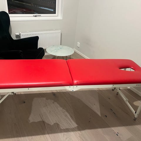 Röd massagebänk i läderimitation, fint skick! Kommer med tillbehör, skydd och väska. Hämtas upp i centrala Göteborg