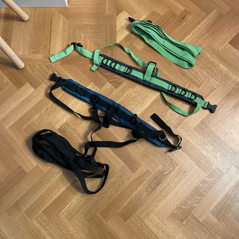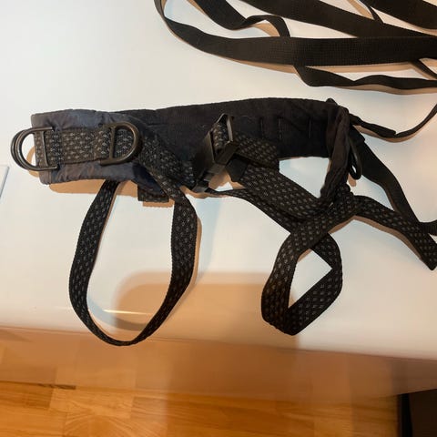 I form av en midjeväska som fästes runt barnets midja samt spänne att fästa mellan benen, så att den ej glider upp.