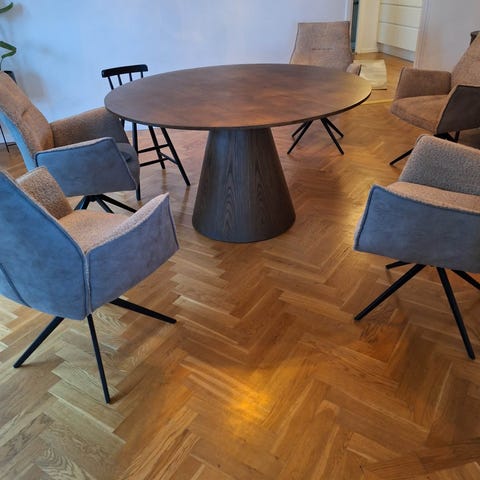 Säljer ett runt matbord i ek från Mio, modell Plaine. Bordet har en diameter på 110 cm och passar perfekt för 4 personer. Stilren och tidlös design som funkar i de flesta hem. Har haft den i ca 7 månader. Bordet är i mycket bra skick, i princip som nytt – inga repor, fläckar eller skador.